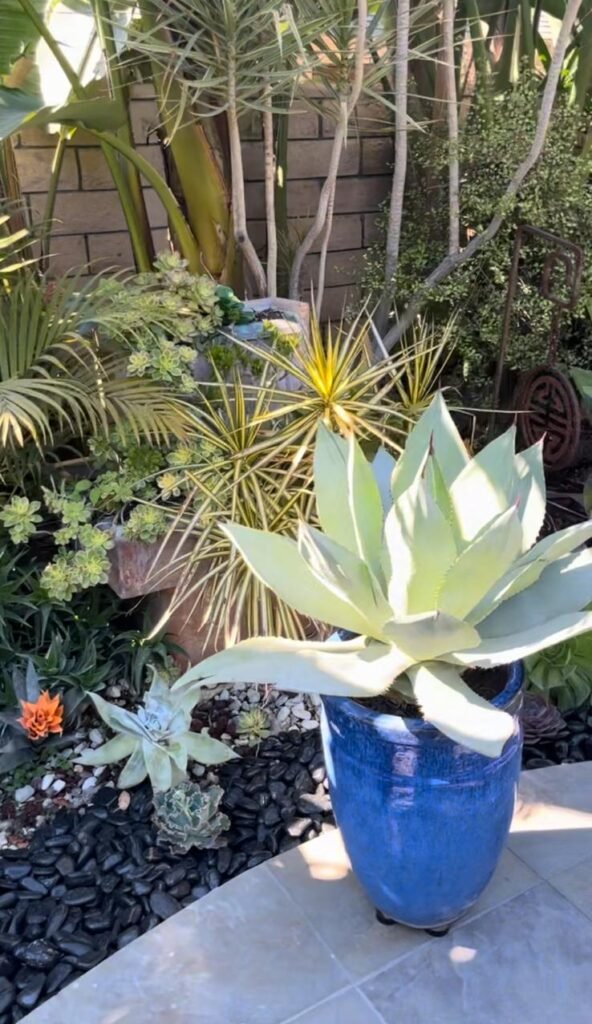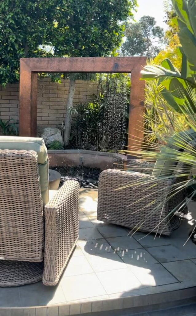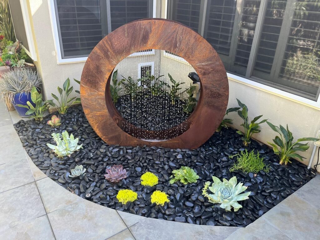A carefully curated palette of semitropical, drought-tolerant plants, paired with the gentle sound of flowing water, creates an inviting environment ideal for quiet reflection or intimate gatherings. A custom firepit crafted from treated concrete adds a striking fire-and-water element, complemented by a dramatic rain curtain feature—evoking the feeling of a true oasis under the stars.